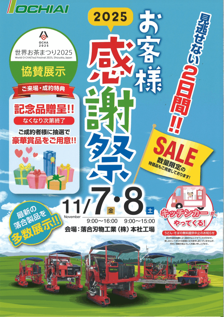 お知らせ 【お知らせ】落合刃物工業「2025お客様感謝祭」のご案内 2025.10.24 落合刃物工業が「お客様感謝祭」を開催いたします! 最新の落合製品を多数展示されます!数量限定の特価品も用意されていますので、ぜひ会場に行ってご覧ください! <開催日時> 日時:11月7日(金)9時~16時、8日(土)9時~15時 場所:落合刃物工業㈱本社工場 Post Share RSS