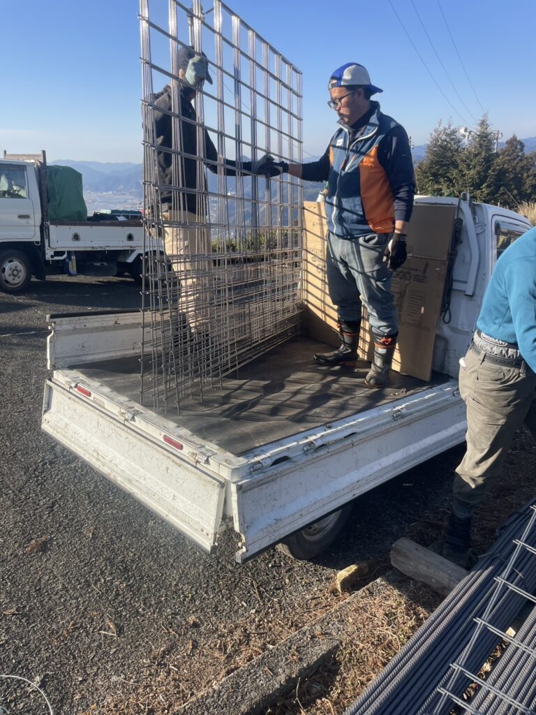 ワイヤーメッシュや鉄筋棒をひたすら人力で運んで、運んで、また運ぶ 作業から始まります。