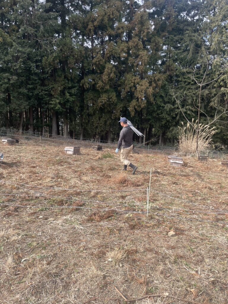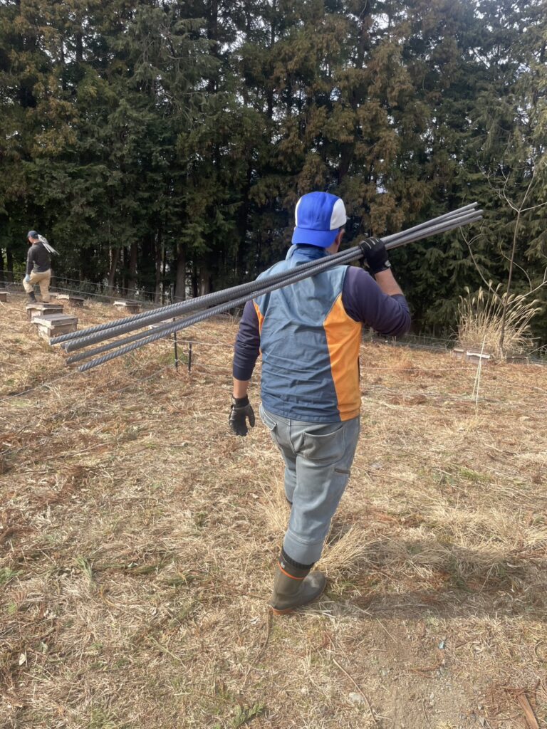 資材を所定の位置まで運び終えたら、次は杭打ちとメッシュ張りの工程へ。