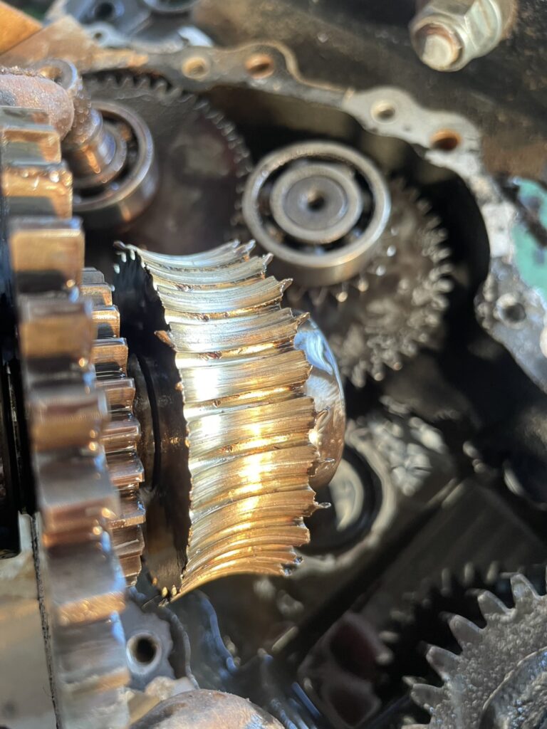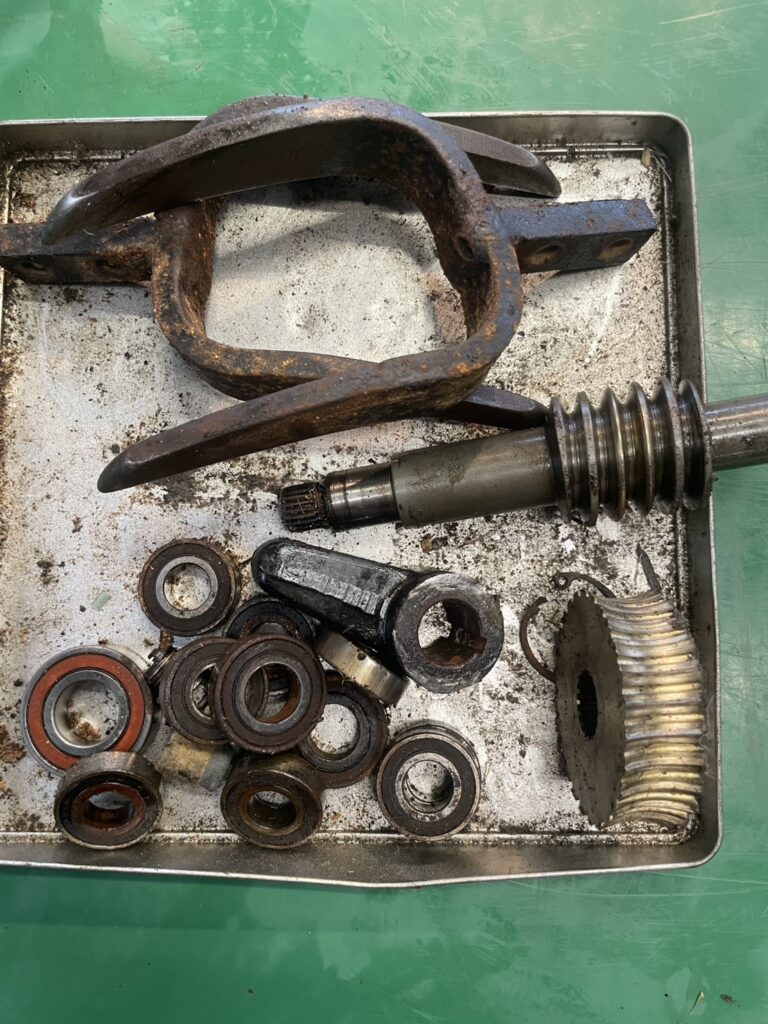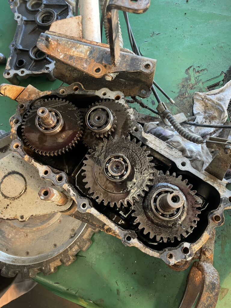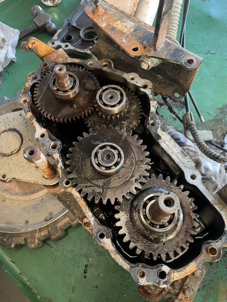 エンジンを降ろし、ミッションを分解して点検したところ、ウォームホイールギアが摩耗している状態、いわゆる丸坊主でした。